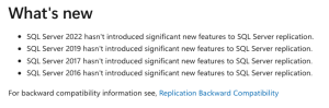 If you think I am trolling, take a look at the picture above with the list of the news from the previous releases of SQL Server, taken directly from the official documentation page for the Replication. Yes, this is almost a month after SQL Server 2025 has been released, and of course, there is not even a mention of it there.